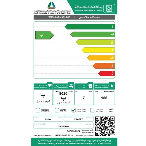 غسالة اتوماتيك 7 كيلو​ فتحة امامية كرافت – أبيض